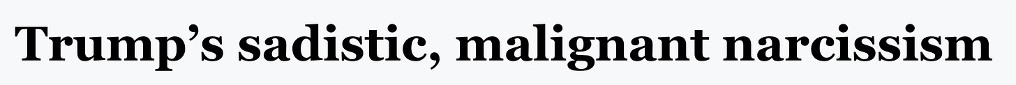 In 2018 I wrote a column for Capitol Hill Blue titled “Trump’s sadistic malignant narcissism” I moved from writing there to Daily Kos where I put all my posts about Trump’s psychopathology under the heading Trumpology (you can read them here if you want to torture yourself). I left there (okay, I was kicked off and suspended for life - this is another story), to my publishing my own blog. Then when Substack became popular for political writing I moved there and continued to write many articles about this.