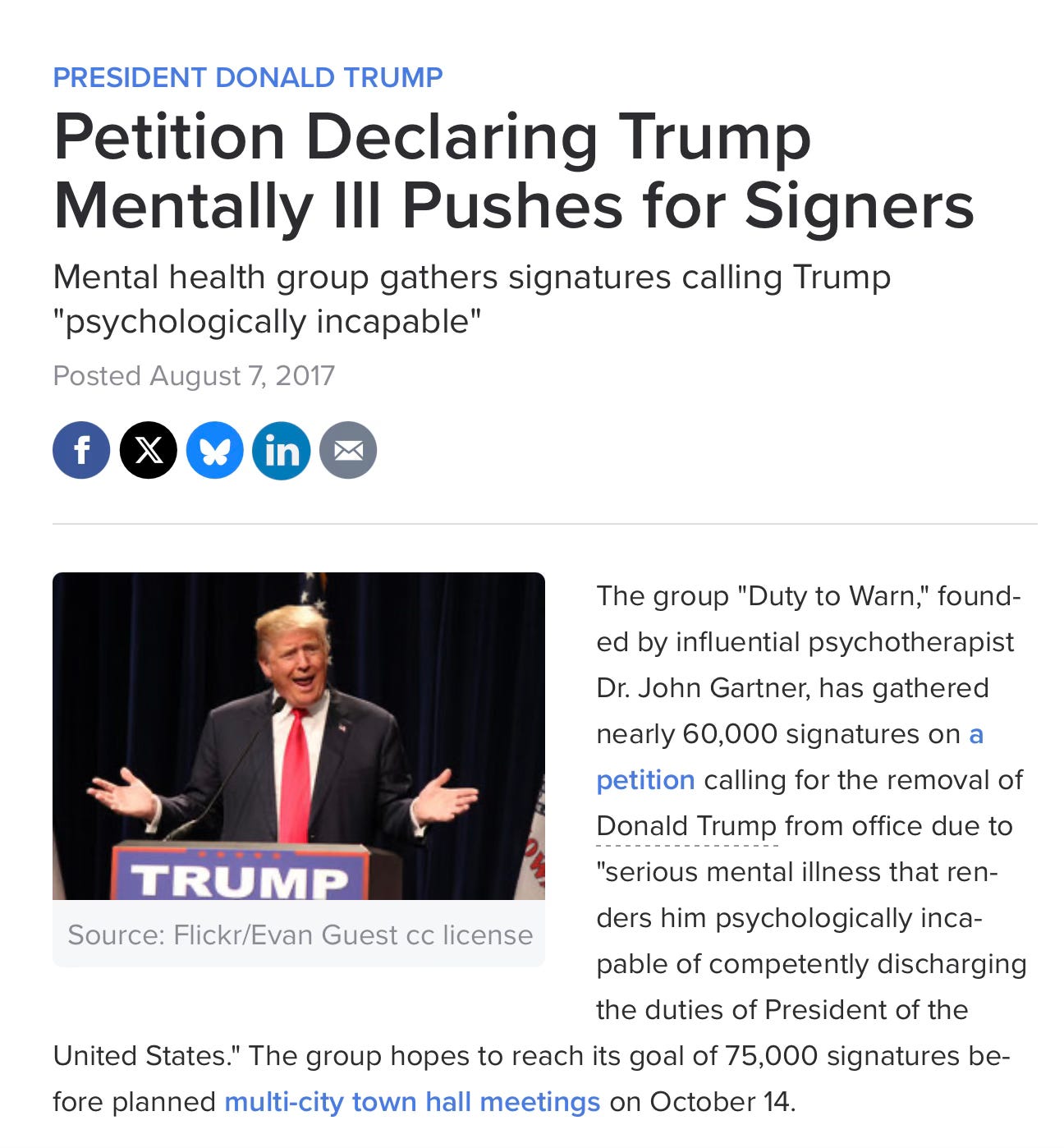 Nearly two years ago one of the first mental health professionals to warn about the dangerousness of Donald Trump because of his psychopathology was clinical psychologist John D. Gartner. Over two years ago he started an online petition Mental Health Professionals Declare Trump is Mentally Ill And Must Be Removed which eventually had over 70,000 signatures.