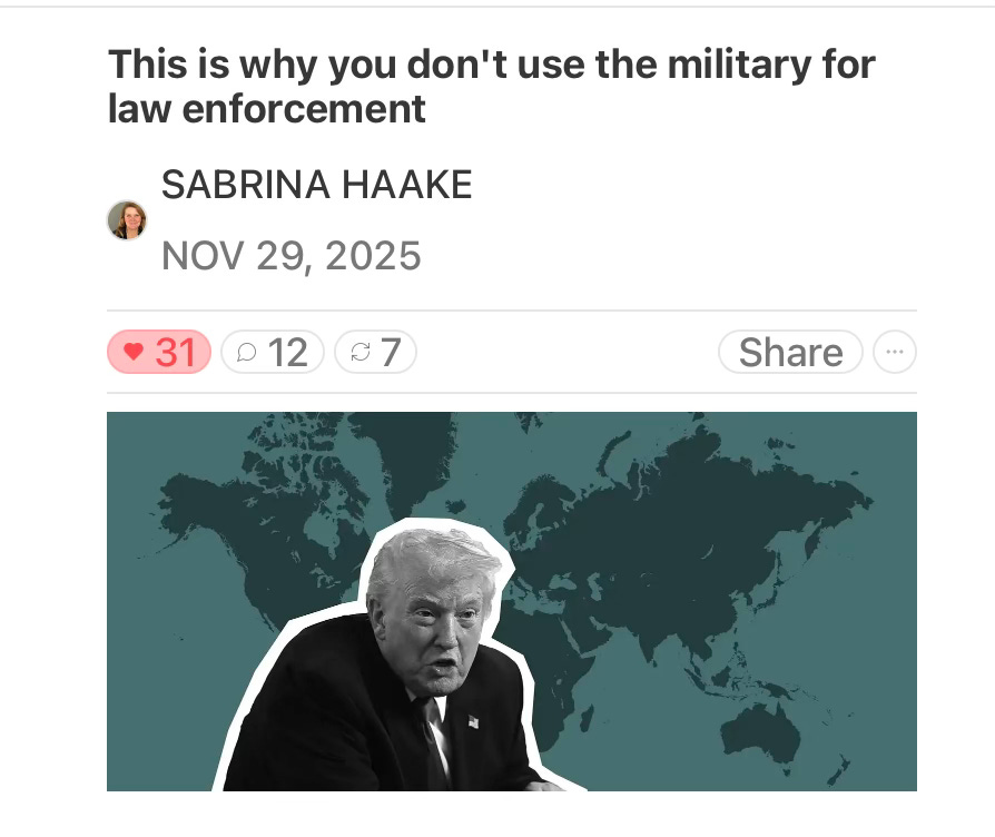 Of course Trump will ignore the law and relish the use of the military to satisfy his need for power, control, and cruelty --- without getting blood on his hands or taking any personal risk. That is for his soldiers to do whether they are in ICE, Customs and Border Patrol, the National Guard, or the active service currently murdering people on boats.