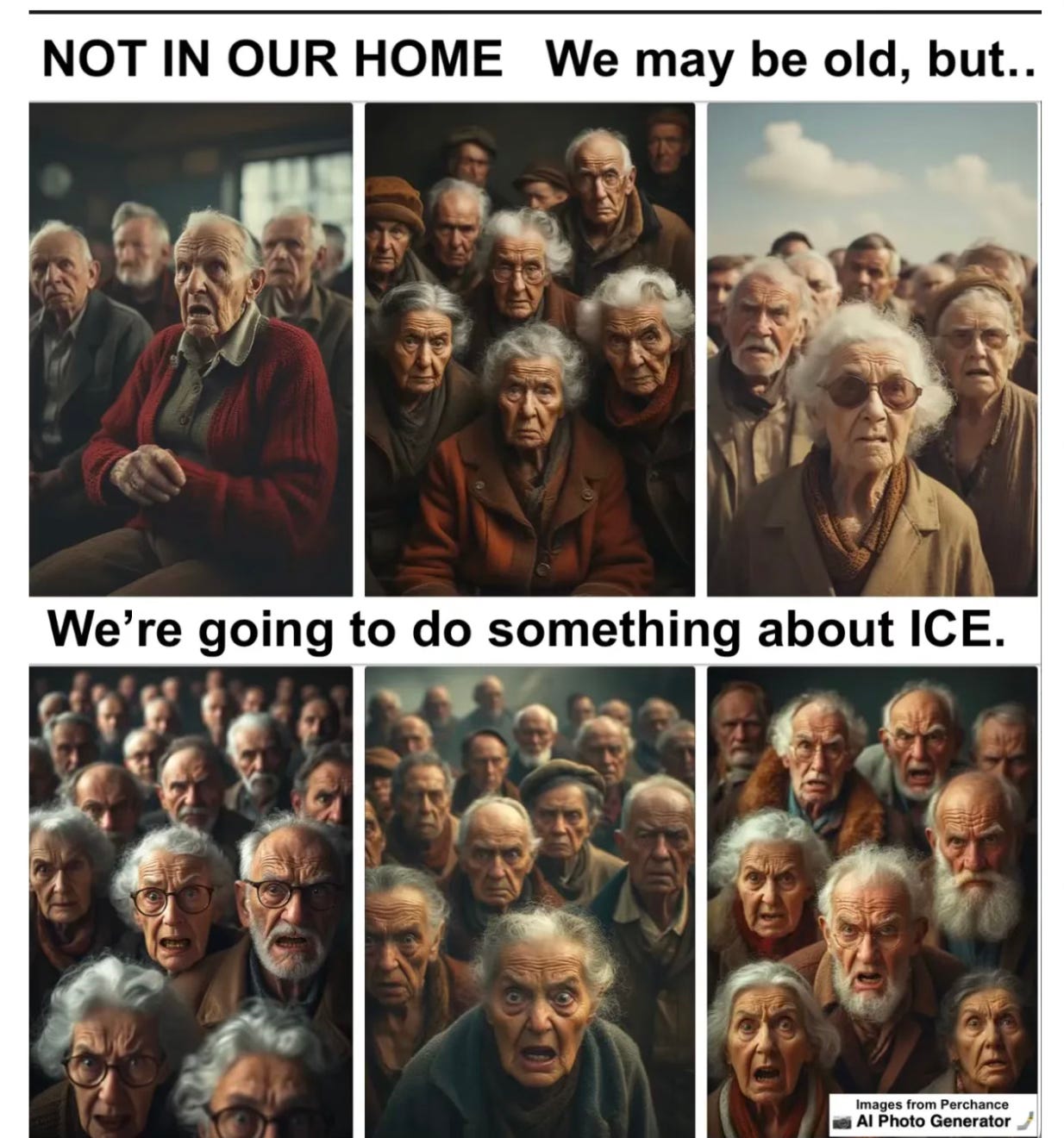 I wrote a short Substack a few days ago titled “Elders Against ICE, Revolutionary War Patriots fought the Redcoats and Hessians, during WWII The Resistance fought the Nazis, today our patriots are dealing with ICE and all it represents.” I was feeling that sense of empowerment when first someone feels helpless to stop a perceived evil and then thinks of something to actually do. I used an AI illustrator to make the image below: