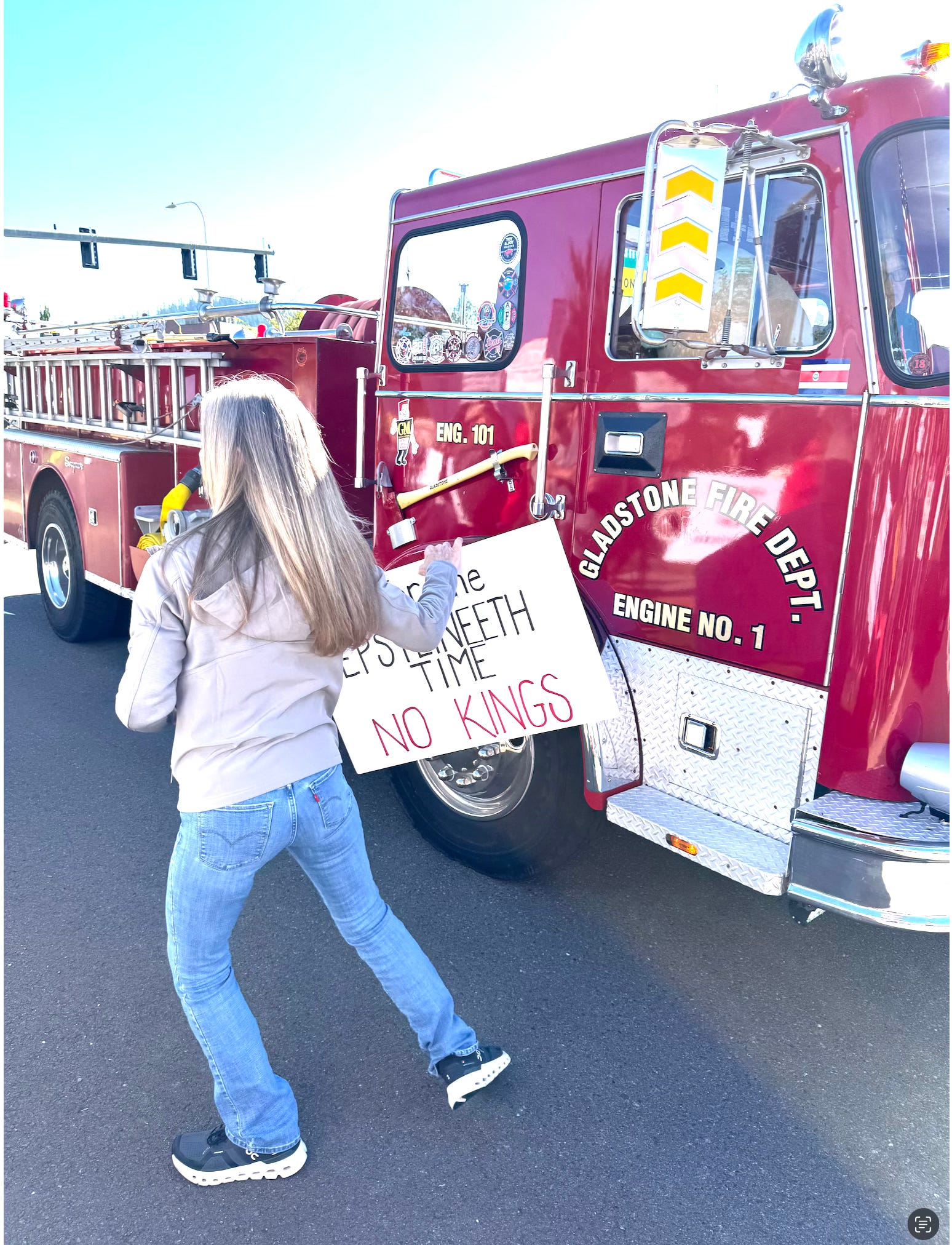 We haven’t had a fire truck drive by three or four times to show support as happened at a huge protest we went to on the Oct. 18th. No Kings Day protest.