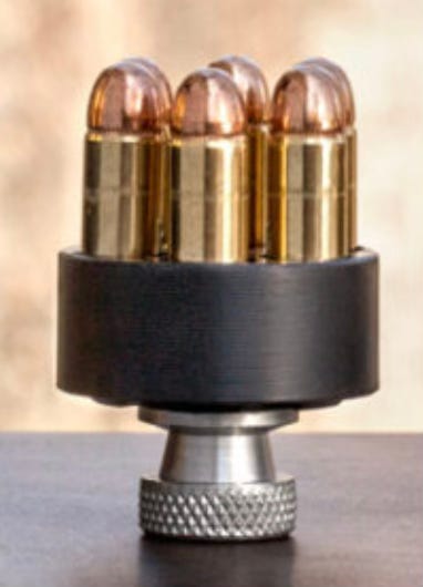 Revolvers do not use bullet clips which enable someone to reload them quickly. They use speed loaders that look like this: