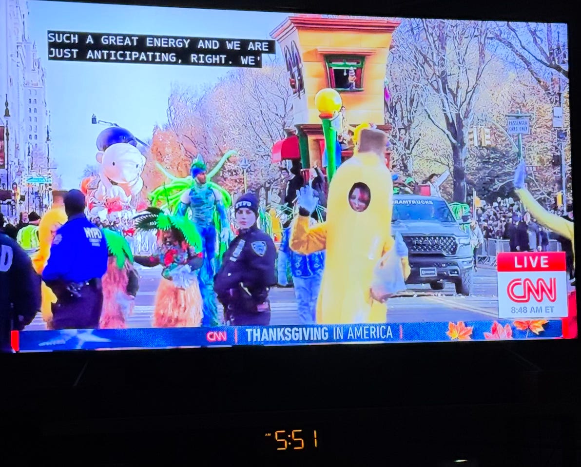 While the parades across the country are celebratory, by chance when I decided to take a photo of what was on my TV screen as I wrote this the woman in the foreground was wearing a costume that reminded me of what many of the protesters against ICE have been wearing. These have been inspired by protestors in my hometown of Portland.