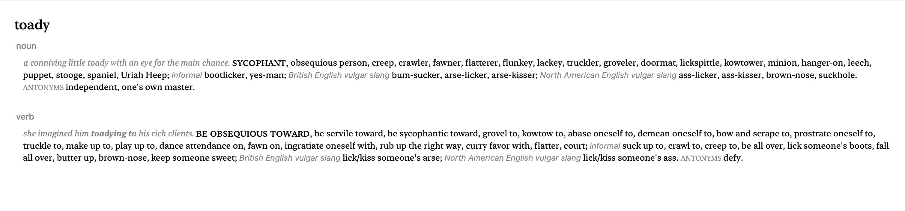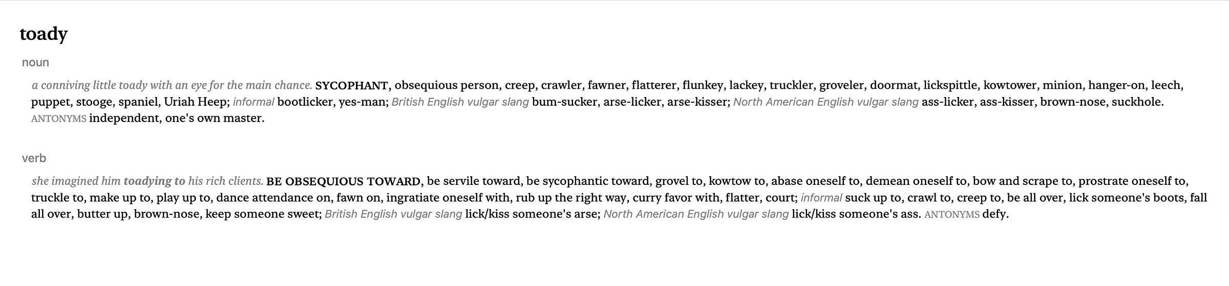 If only these were real amphibians. At least most toads play an important beneficial role in the ecosystem (read article). They are more like the exception, cane toads which have toxic skins and a voracious appetites. They are now considered a pest and an invasive species in many of its introduced regions. You can chose your synonym for these human toadies (click below to enlarge):
