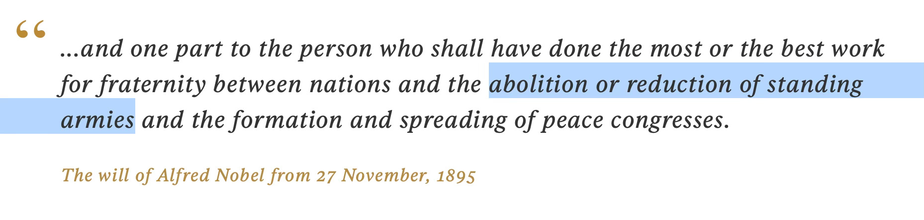 One might wonder what Nobel would have thought about the army Turmp has been building under the guise of fighting crime and illegal immigration. He also might wonder about Trump trying to run roughshod over the fraternity between free nations by cozying up to authoritarian counties.
