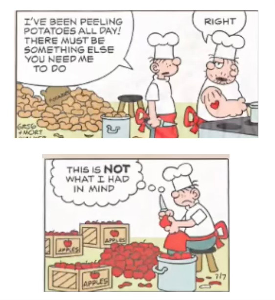 He told it as if it really happened to him when he was in the Army. He set it up by explaining how the mess hall cook was not someone to trifle with because, as a master sergeant, he could order troops to do the most boring repetitious KP like peeling potatoes for weeks at a time.