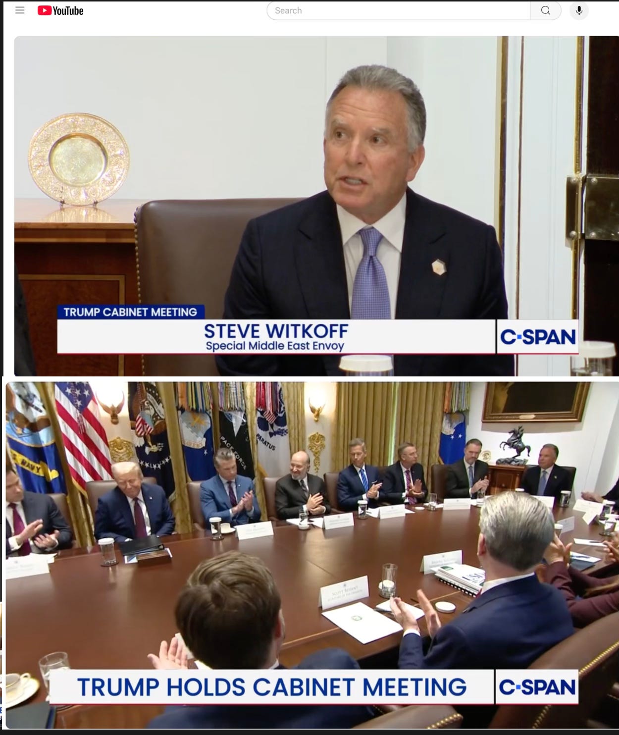 Two things struck me watching the news last night. One was a video of the Trump Cabinet meeting a few days where Steve Witkoff, United States Special Envoy to the Middle East, pitched Trump as the “single finest candidate” ever for the Nobel Peace Prize.