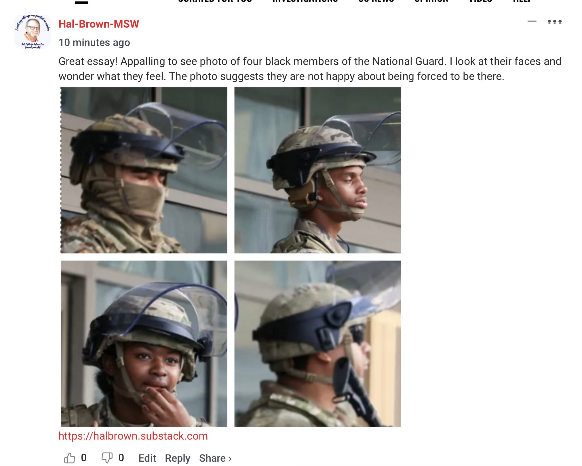 Whether or not RawStory decided to use the photo they did is also open to speculation. They are a progressive publication so I wouldn’t be surprised it they decided to highlight the presence of Black soldiers in the photo. It was taken in Los Angeles. They chose it from all the other photos of Naitonal Guard in L.A. and in D.C.