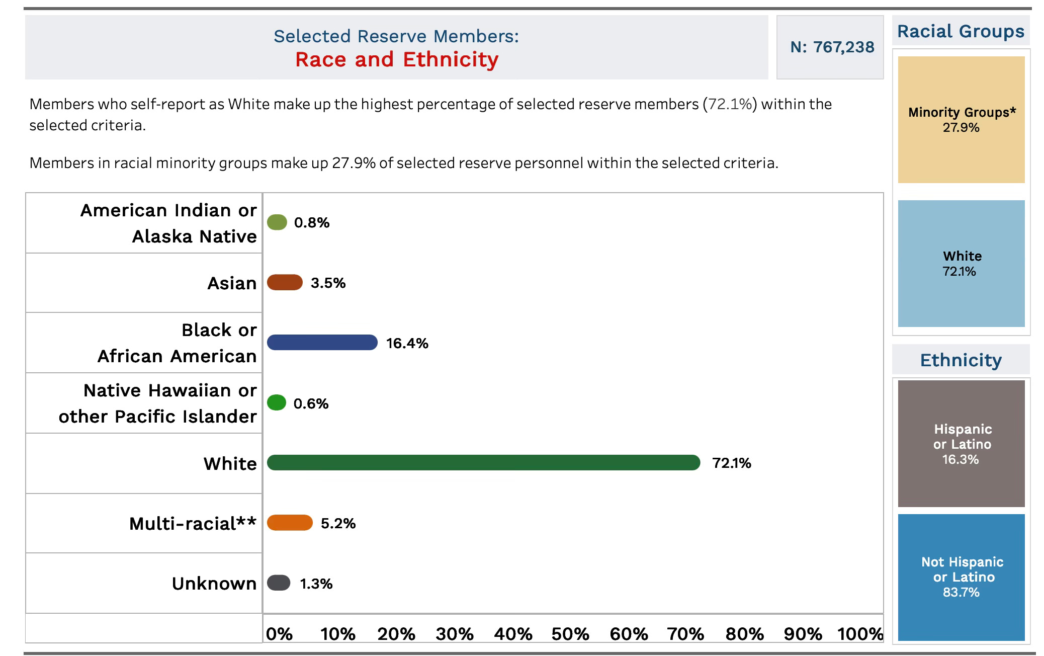 The chart below is (from the official (now Dept. of War website, though still shown as Defense Department). It shows the ethnicity of National Guard members (click to enlarge).