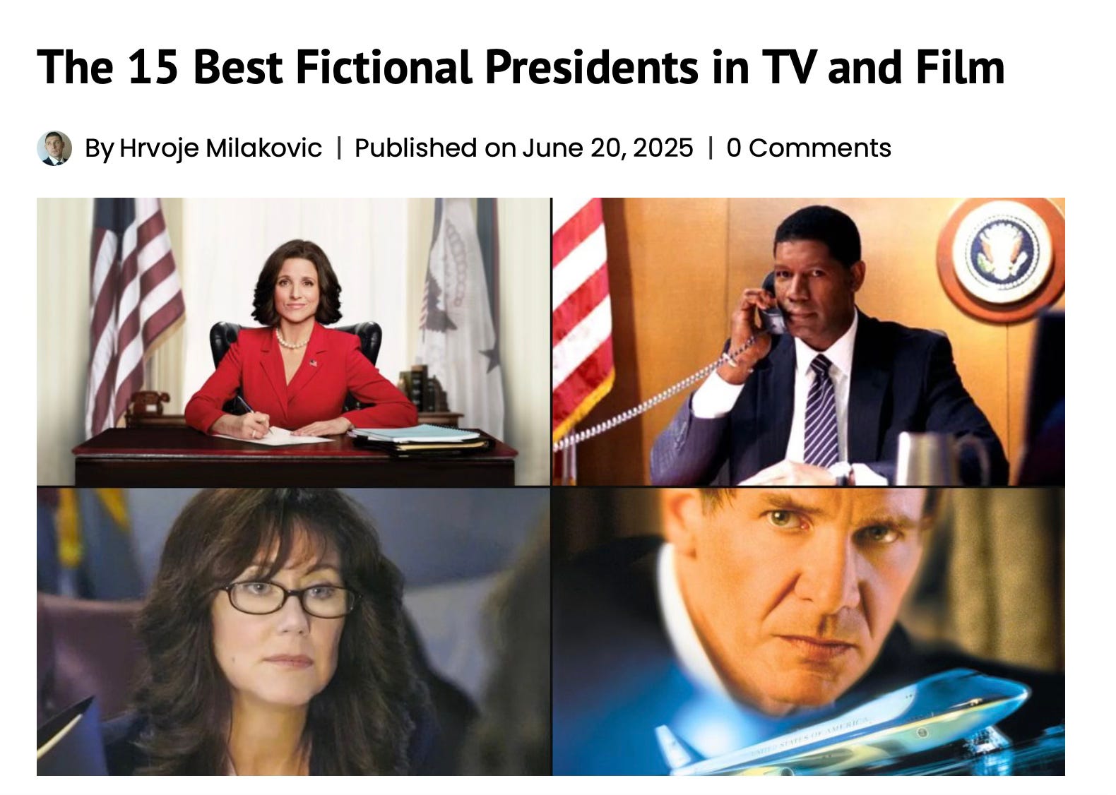 Here are 15 fictional American presidents in TV and movies. Everyone has their favorite. Mine is Kiefer Sutherland’s Tom Kirkman in “Designated Survivor.” I know lots of people like Martin Sheen’s Jed Bartlet (“The West Wing”) but I enjoyed seeing how the Kirkman character evolved from being an obscure “designated survivor” into a highly capable leader.