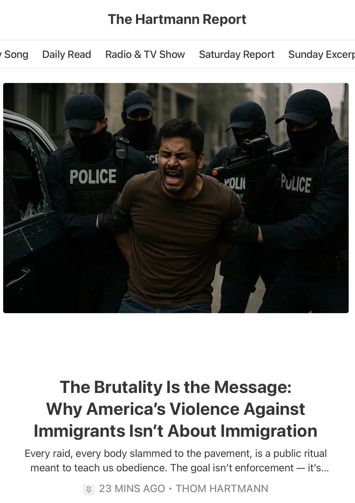 The subtitle “Every raid, every body slammed to the pavement, is a public ritual meant to teach us obedience. The goal isn’t enforcement — it’s submission...” is so true and should be incredibly terrifying. It is, as you say, without using the word “Hitlerian” right out of Hitler’s playbook. I haven’t read that this was spelled out in Project 2025. I don’t think there’s a chapter on the use of systematic sadistic terror as a major tactic in their overrall strategy. What has been transpiring with this use of brutality as major modus operandi to instill obediance through fear has led me to do my own rebranding for No Kings day. I hate to throw shade on the original intention and coining of the label, but King George III was not Adolph Hitler.