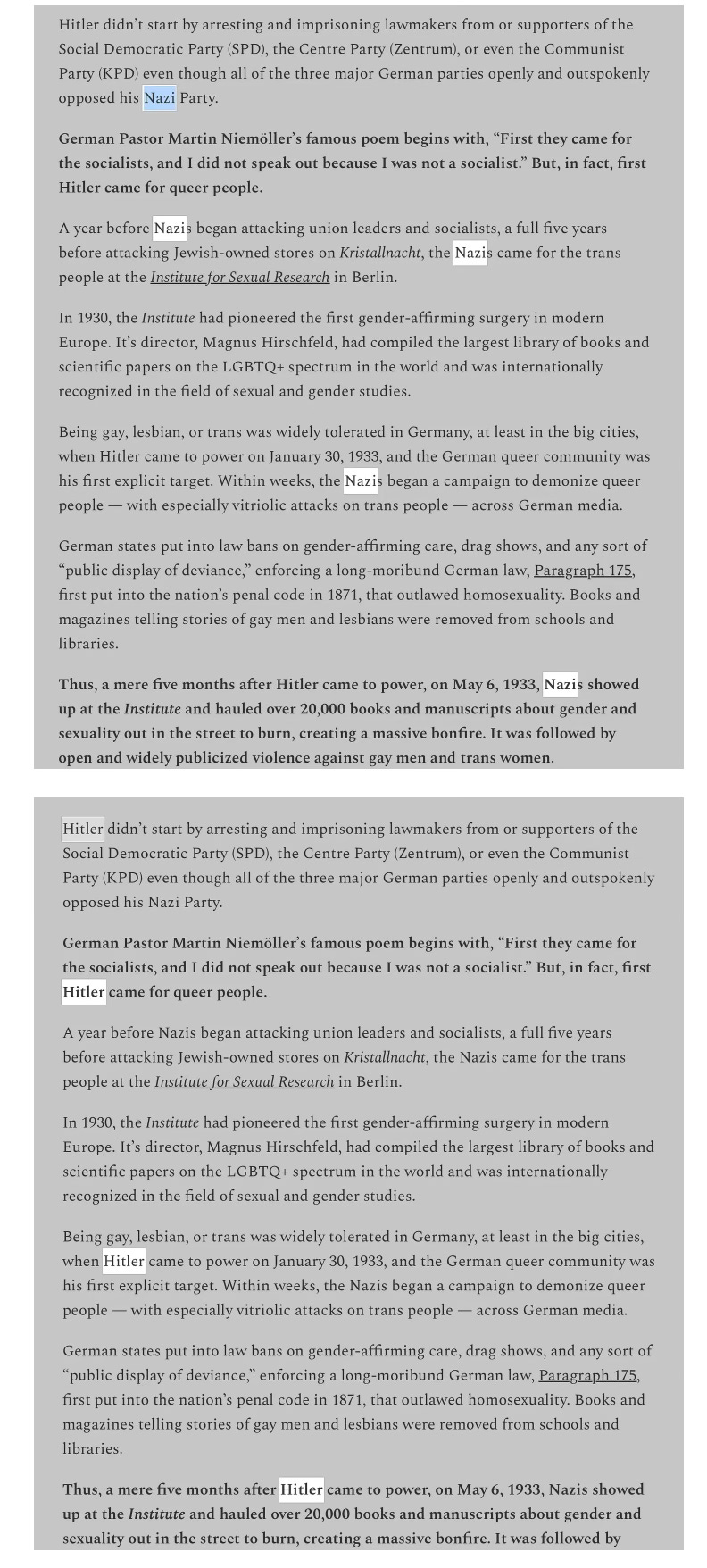 In it he refers to Hitler five times and the Nazi’s seven times. Below I highlighted most of the references.