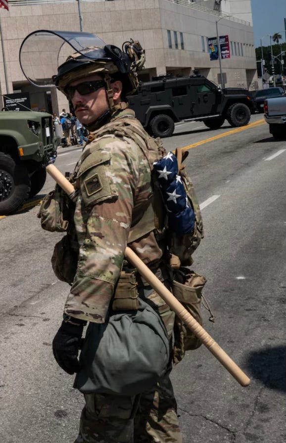 The soldier in the foreground doesn’t seem to have a firearm, but he does have a long baton under his arm and, oddly, an American flag on his back.