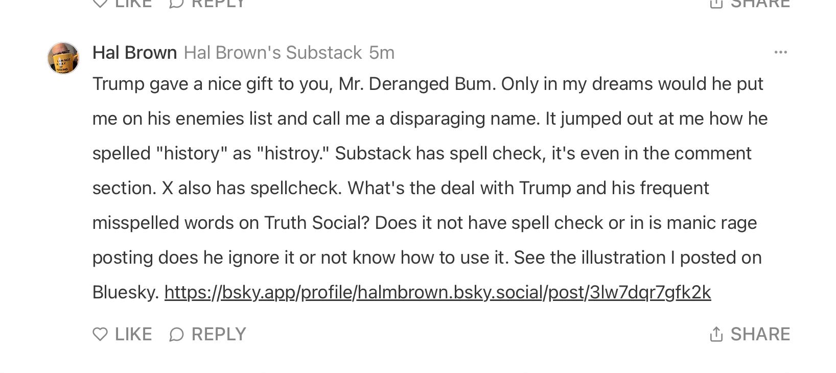 But, hey I’m human, and considering the time and effort I put into my writing I like knowing people appreciate little old me. I would welcome joining the Trump Esteemed Enemies list and having him call me a nasty name. I could write a Substack about it and put the name in my profile.