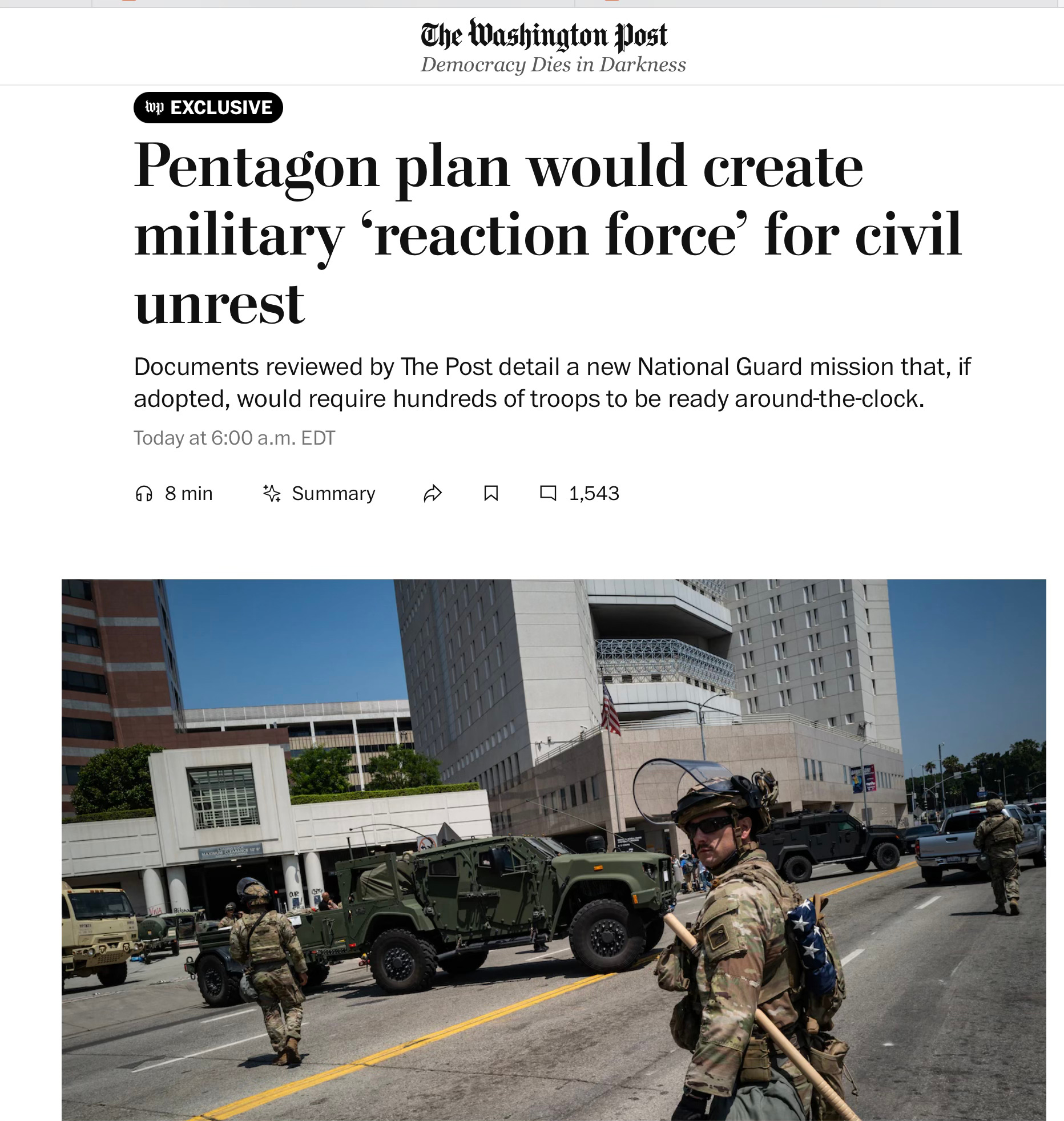 The article summarizes The Washington Post (subscription) article “Pentagon plan would create military ‘reaction force’ for civil unrest.”