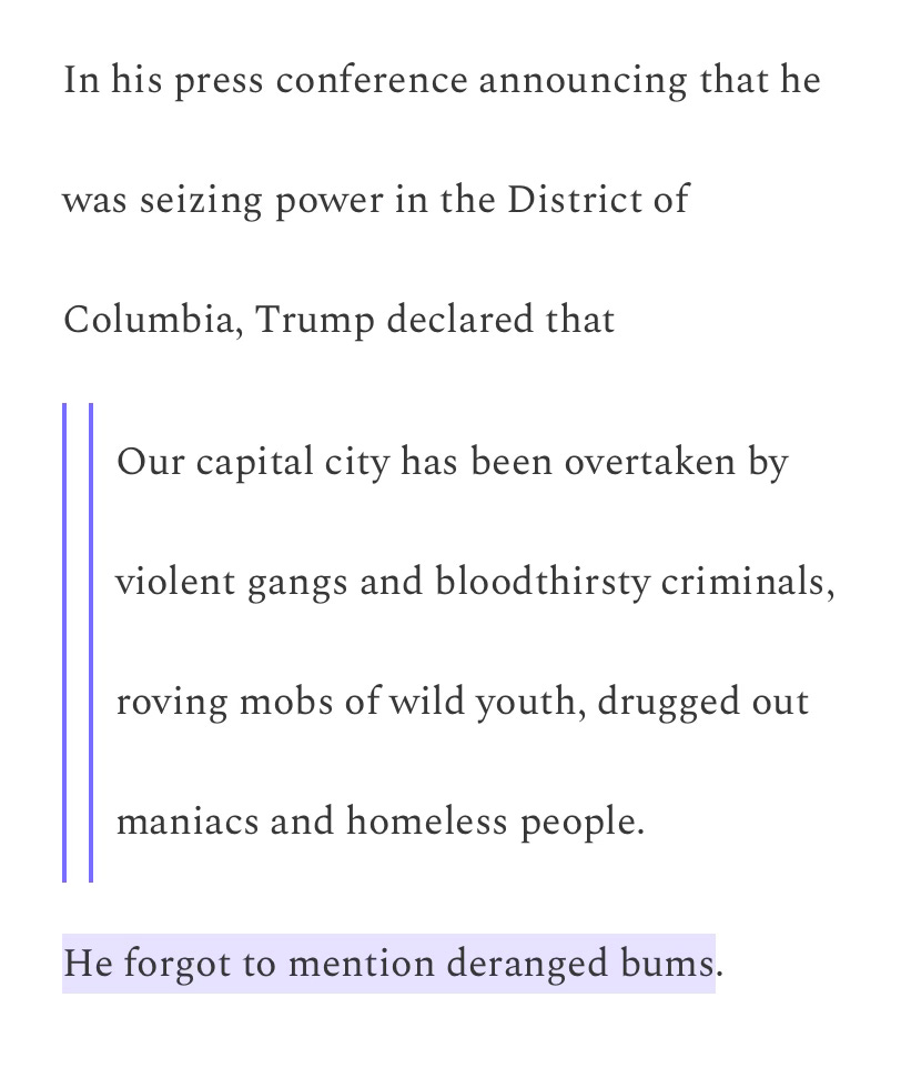In his serious Substack regarding Trump’s lies about violence in D.C. Krugman managed the following bit of levity: