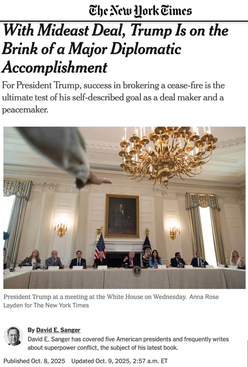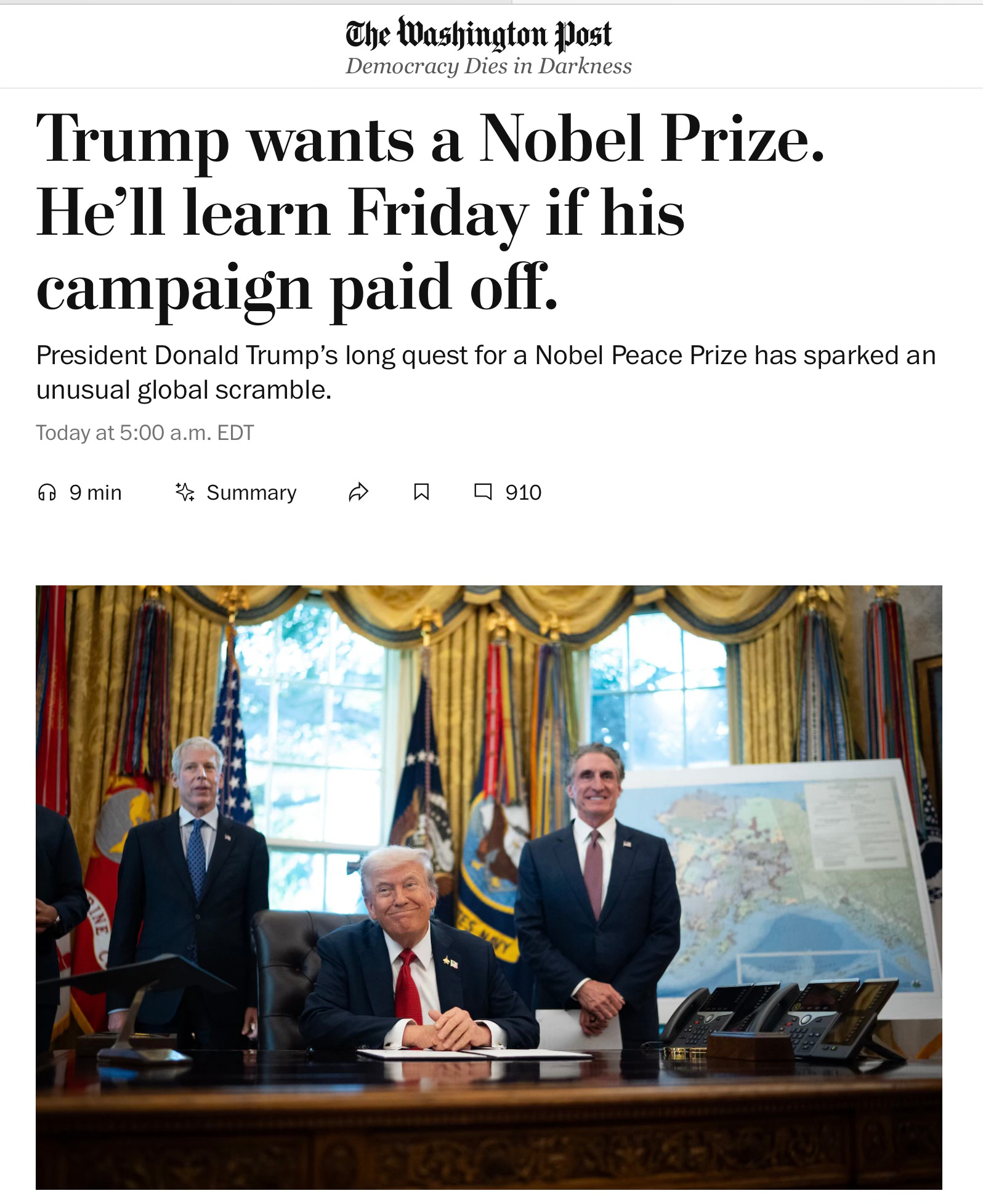 For Mr. Trump, success in this venture is the ultimate test of his self-described goal as a deal maker and a peacemaker — and a pathway to the Nobel Peace Prize he has so openly coveted. By chance, the winner for 2025 is scheduled to be announced just hours before he may be departing to take his victory lap in Egypt and Israel.