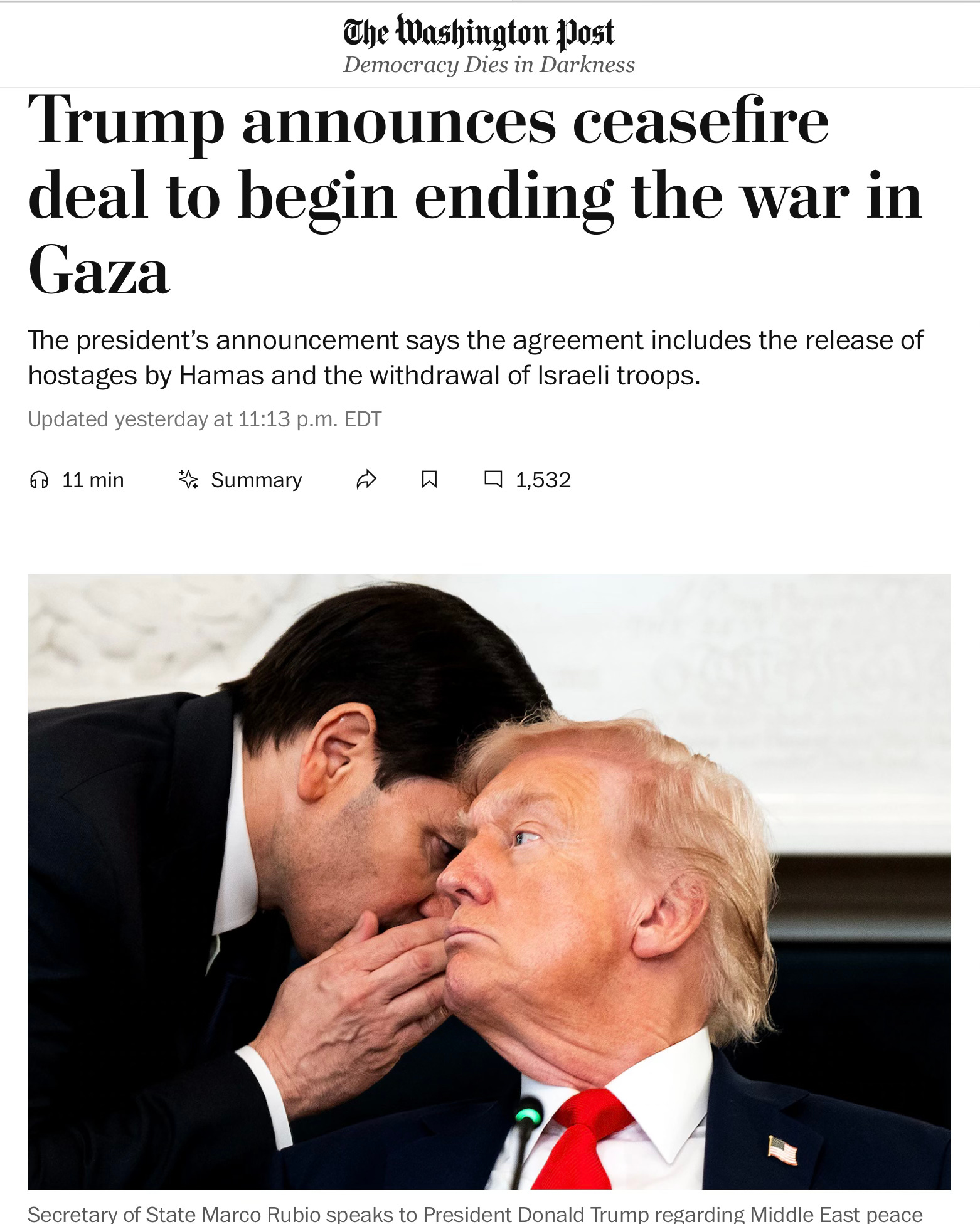 “I am very proud to announce that Israel and Hamas have both signed off on the first Phase of our Peace Plan. This means that ALL of the Hostages will be released very soon, and Israel will withdraw their Troops to an agreed upon line as the first steps toward a Strong, Durable, and Everlasting Peace “BLESSED ARE THE PEACEMAKERS!”