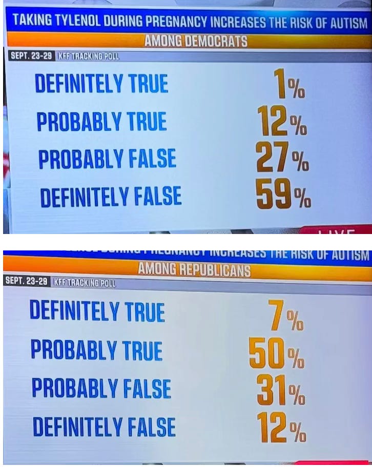They showed a video of Trump unequivocally stating that nobody should take Tylenol and showed the result of the poll about how Amercians in general felt about the risk of taking Tylenol. Here’s the breakdown by Democrats and Republicans: