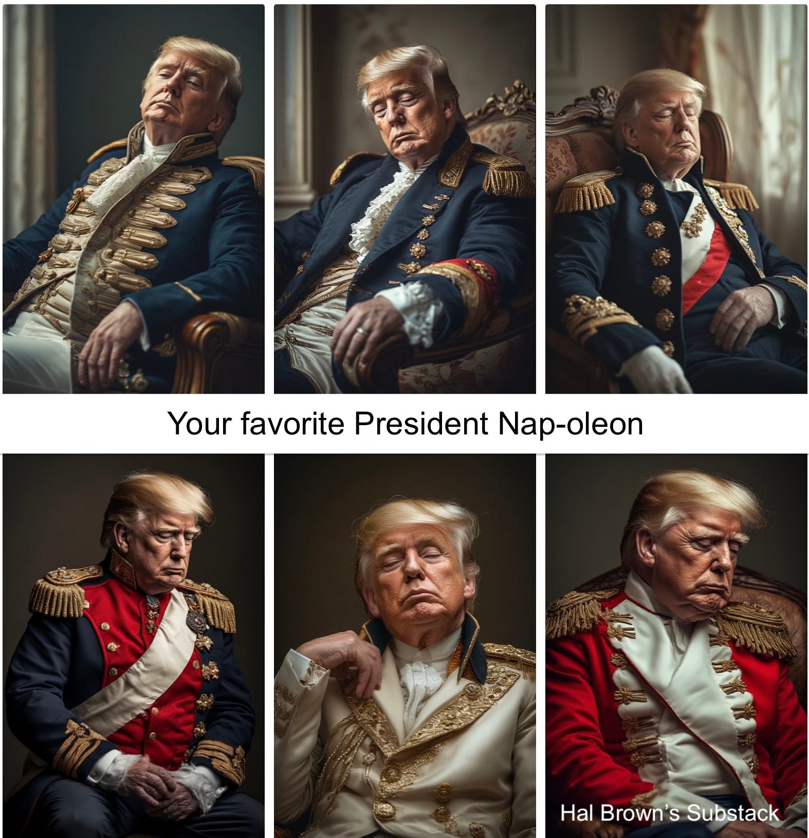 I am under no illusion that my using AI to make images of Nap-oleon Trump like these > 1 does anything more than provide me amusement. I’d hoped it would amuse my readers. It doesn’t solve anything. It is just an escape, a momentary respite.
