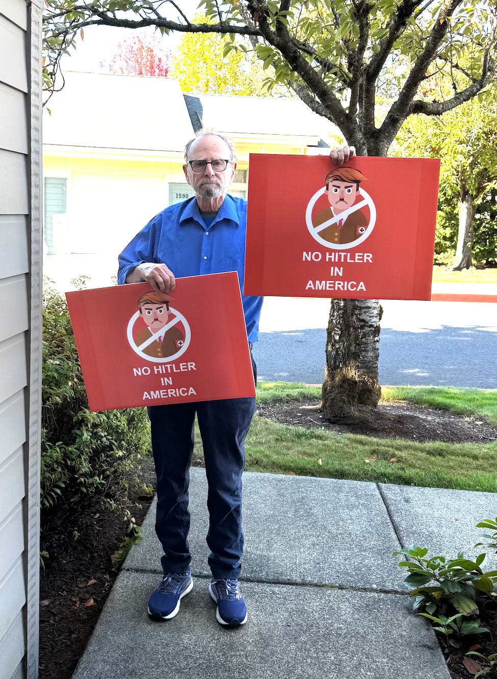Because we know that Trump is far worse that George III ever was, we had No Hitler signs (shown with me holding them below) custom made for the rally.