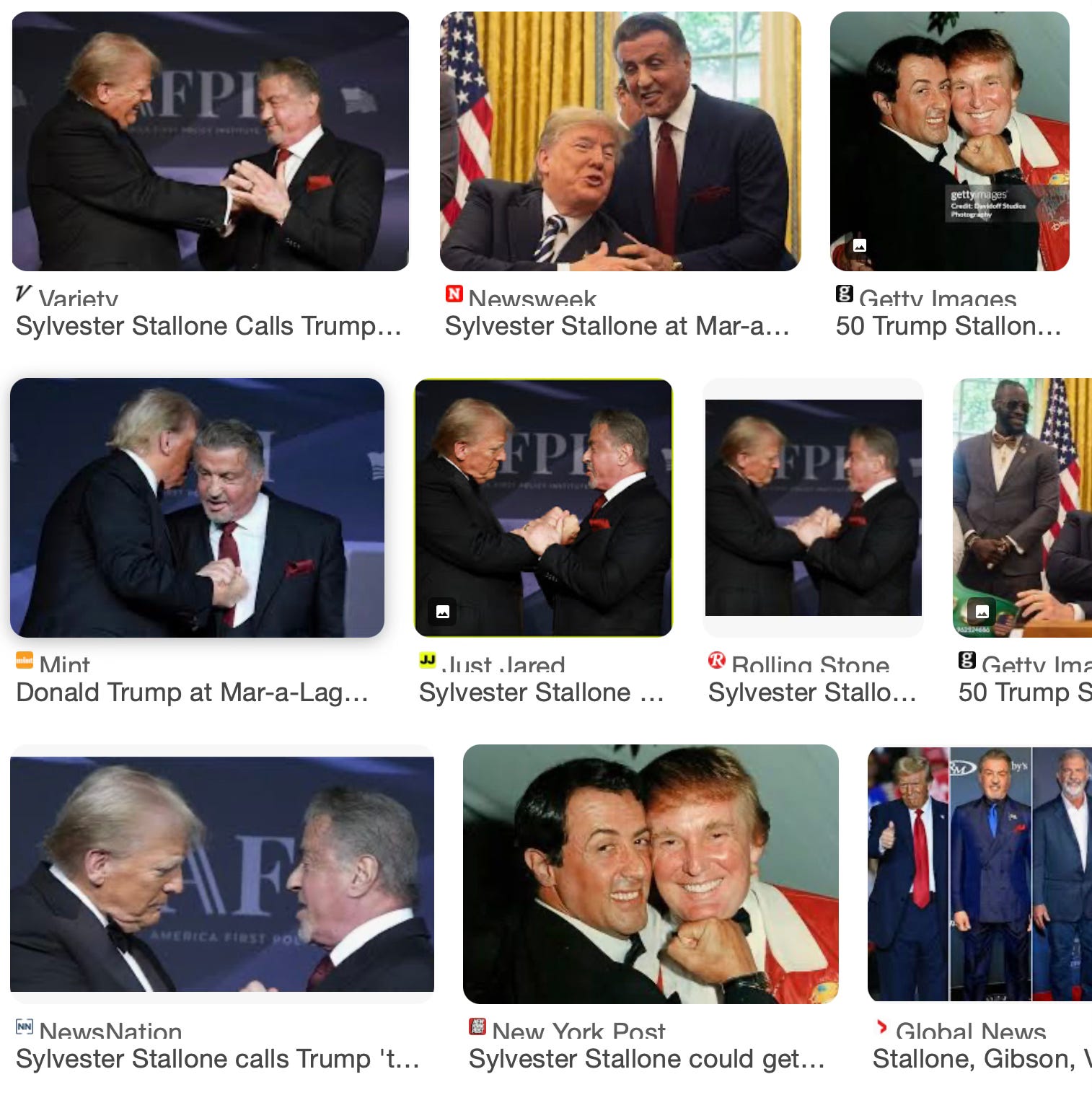 Washington is the president known for the “I cannot tell a lie” cherry tree myth (article). If there’s any doubt that Trump who is as demonstrably lovey dovey with Sly as he can be with anyone of the male persuasion look at the photos below:
