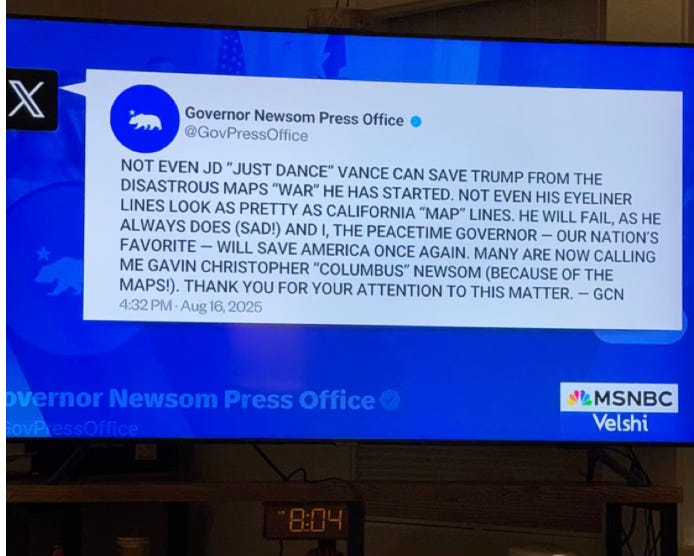 NOT EVEN JD “JUST DANCE” VANCE CAN SAVE TRUMP FROM THE DISASTROUS MAPS “WAR” HE HAS STARTED. NOT EVEN HIS EYELINER LINES LOOK AS PRETTY AS CALIFORNIA “MAP” LINES. HE WILL FAIL, AS HE ALWAYS DOES (SAD!) AND I, THE PEACETIME GOVERNOR — OUR NATION’S FAVORITE — WILL SAVE AMERICA ONCE AGAIN. MANY ARE NOW CALLING ME GAVIN CHRISTOPHER “COLUMBUS” NEWSOM (BECAUSE OF THE MAPS!). THANK YOU FOR YOUR ATTENTION TO THIS MATTER. — GCN