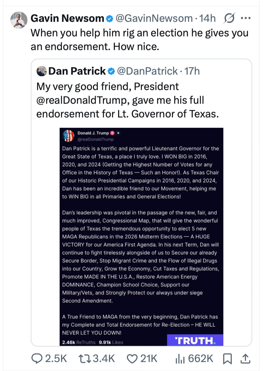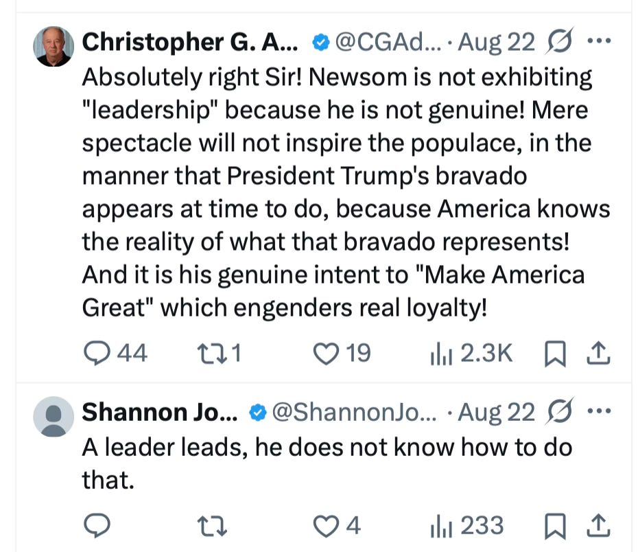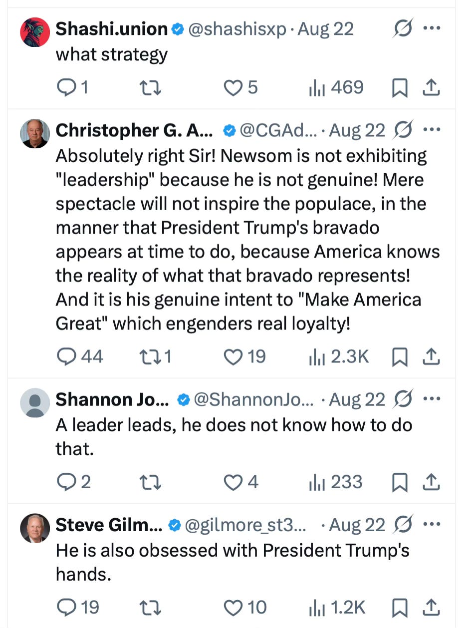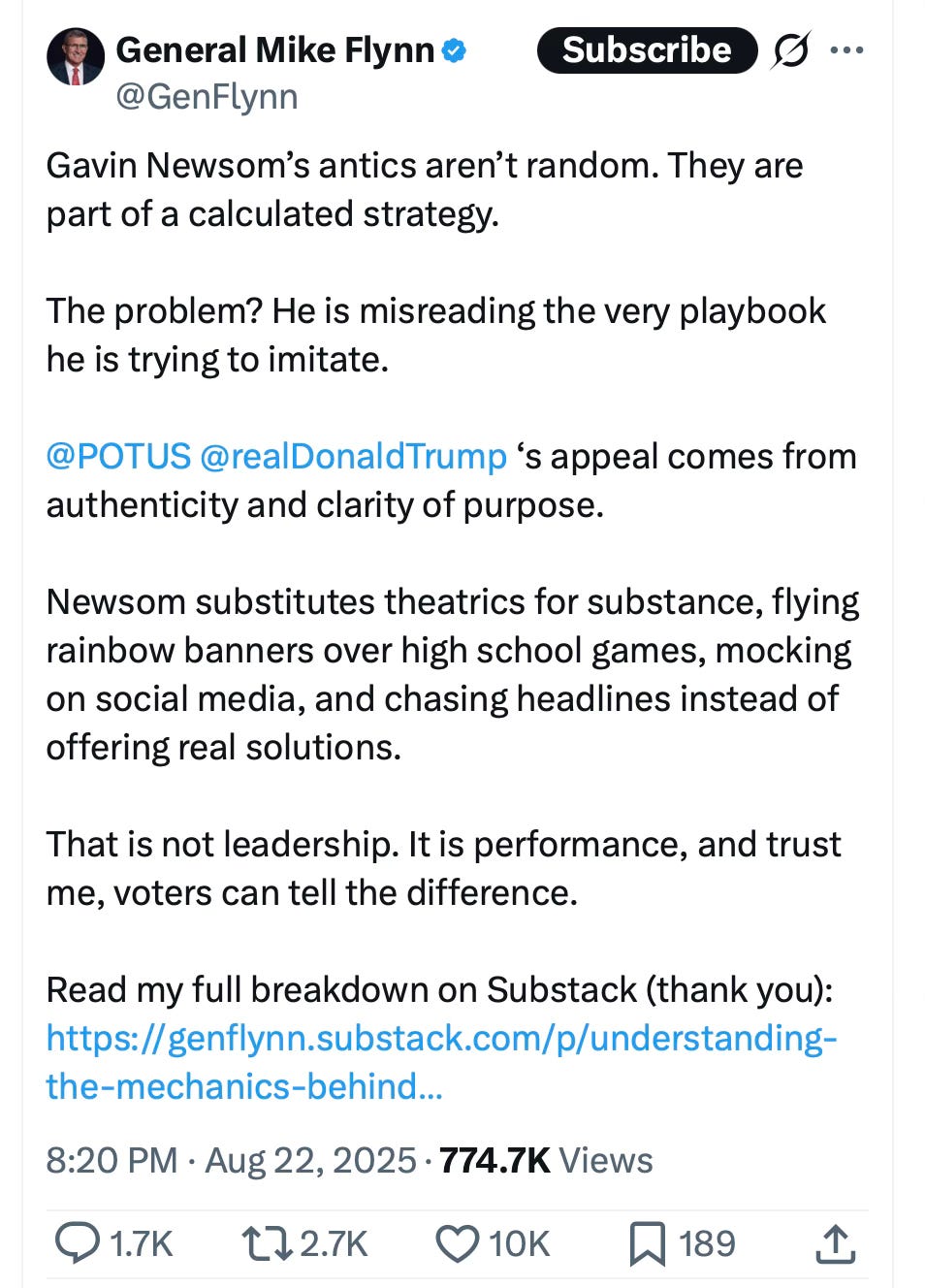Newsom’s X tweets have led to responses from people like Trump toady Gen. Mike Flynn. I won’t go into the level of bullshitting demonstrated in what he wrote. I also won’t put a direct link here to Flynn’s Substack. You can find it yourself.