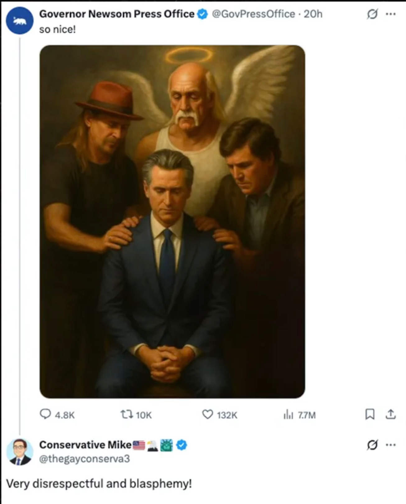 To his credit, Newsom is slowly rolling out the AI imitations of Trump’s delusional depictions of himself as the savior of the American way. This one had an ironic reply saying it was disrespectful and blasphemy. I assume it was blasphemous for him to show Hulk Hogan as an angel.