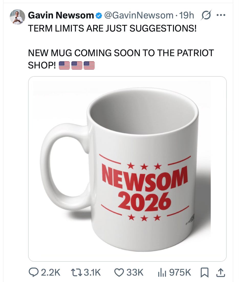 Newsom is subject to California's term limits, which allow a governor to serve a maximum of two four-year terms. He will complete his second term in January 2027 and will not be eligible to run for reelection. Even so, he has said in a tweet that he may be selling a cup: