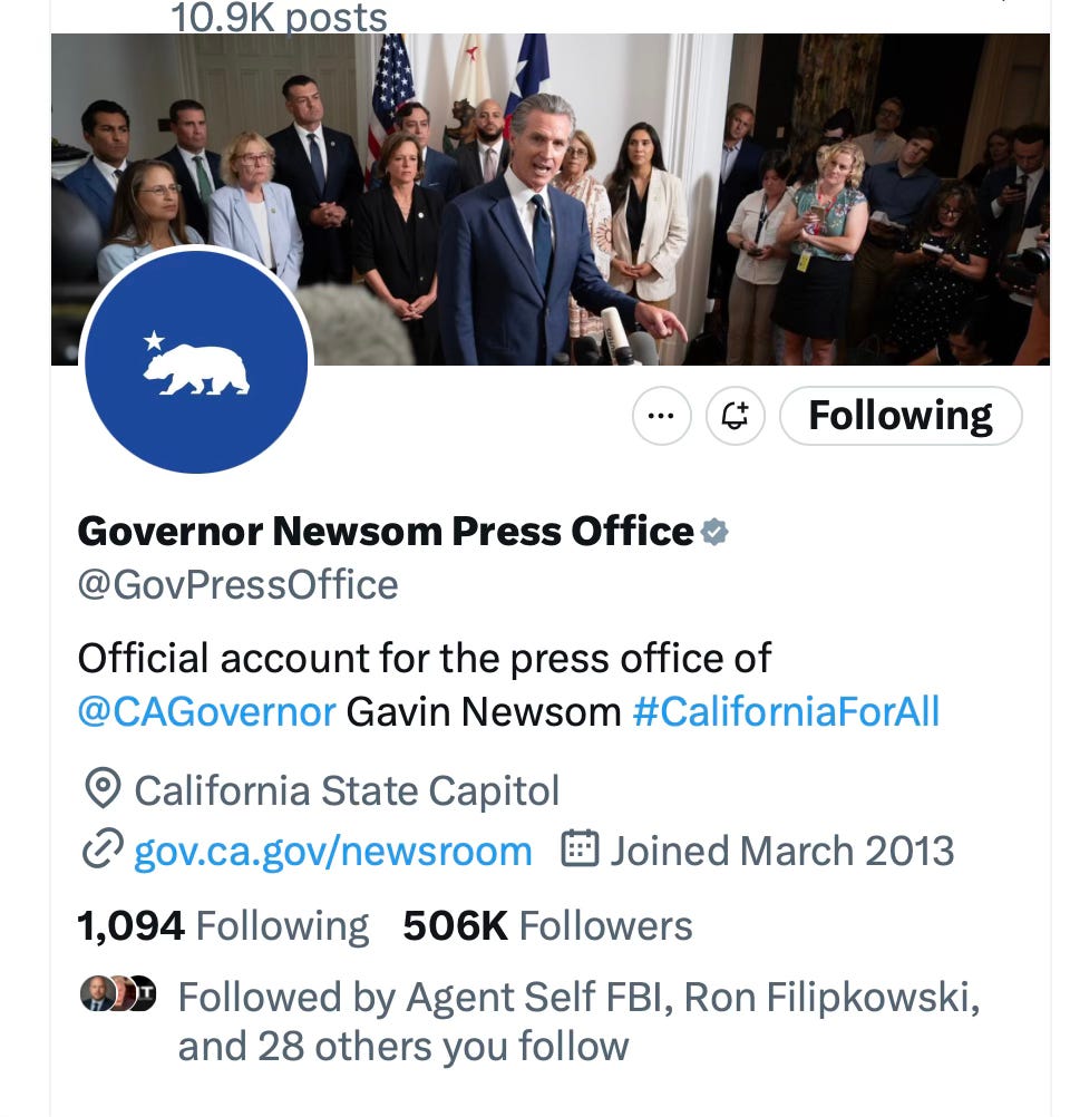 Whether the tweet comes from Newsom’s personal X page or the press office they seem like they were, or could have been written by Newsom. This, on the press room page, is a good example: