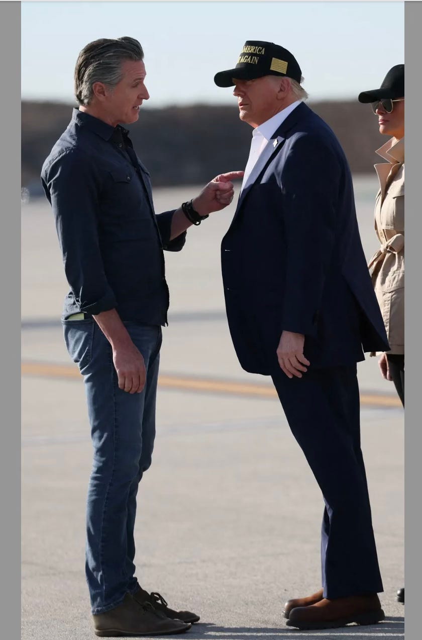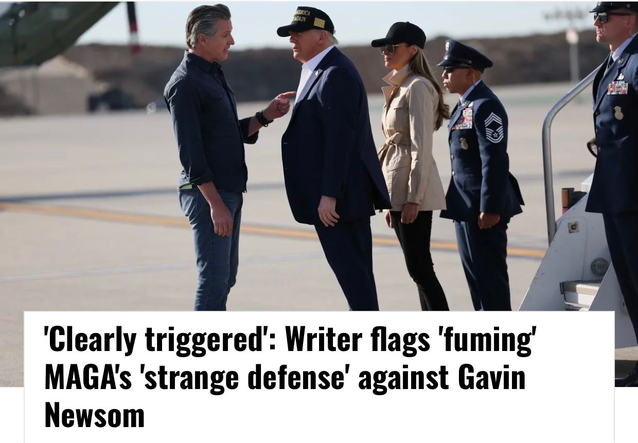 I never tire of the photo used here. Trump apparently thinks he is leaning in so he can intimidate, but he just looks unbalanced confronting someone he considers scum. Standing tall, Newsom is pointing at his chest as if he's keeping him from falling flat on his orange face. He’s backed up by Melania, two airmen, and Air Force One, which is the ultimate phallic symbol. Does this cause Newsom to quake in fear?