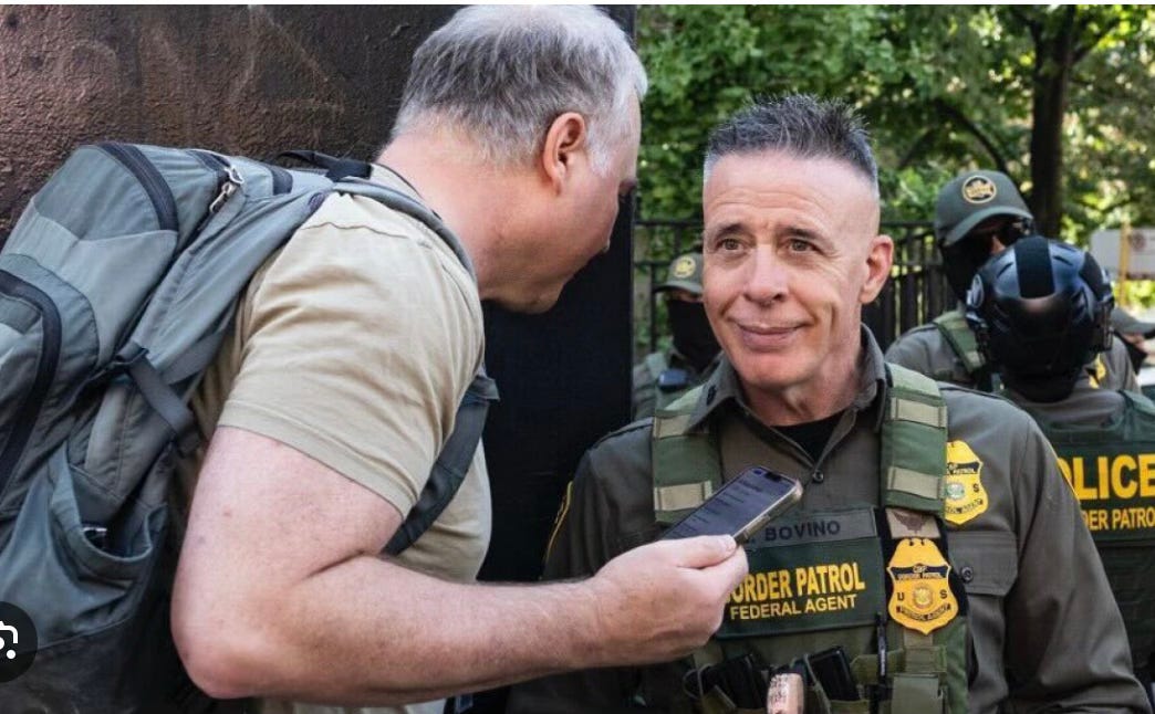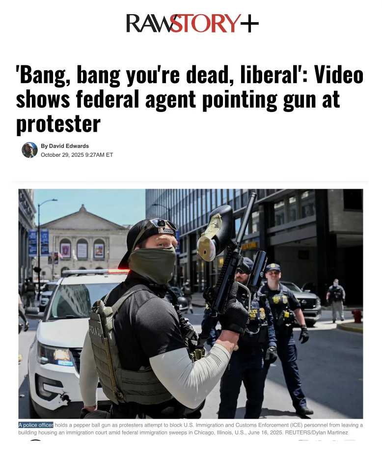 I highlighted three words in the caption to the photo they used: “a police officer” because the man shown with the pepper ball gun is obviously not a police officer. Police officers do not dress like this and wear masks under normal circumstances. It is one of Trump’s enforcment thugs from who knows what agency. All we really know about him is that he likely works out a lot to have massive shoulders and biceps. This, to people like Pete Hegseth, qualifies one to be a soldier. Perhaps Bovino thinks along these lines as well:
