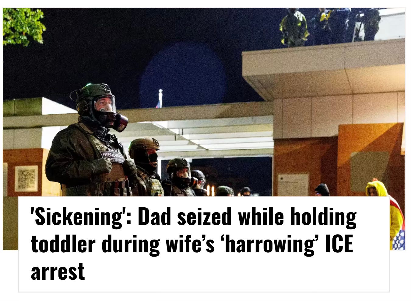 Read the above article: ‘Sickening’: Dad seized while holding toddler during wife’s ‘harrowing’ ICE arrest. The photo RawStory published was taken outside the ICE facility in my city of Portland. Below is my comment about it: