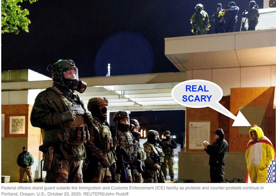 Wanna bet that the 11, whatever the hell they’re supposed to be, goons at the Portland ICE facility would wet their pants wishing that the protestor in the chicken suit pulled a pistol. He’d be so pumped full of lead he could be used as an anchor.