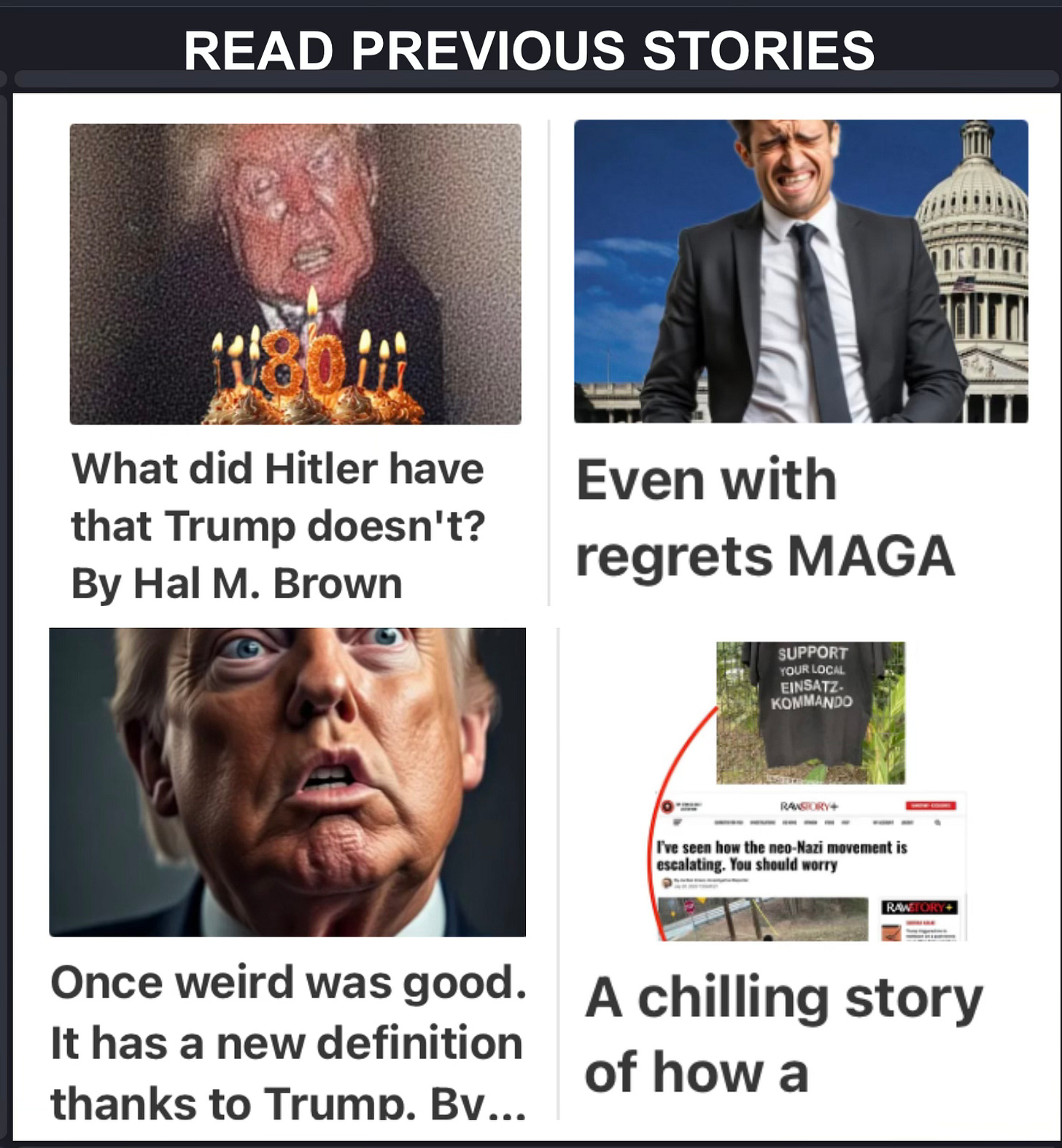 I looked up synonyms for hail and salute and the only one that sounded like it could be used for Trump as heil was used for Hitler was “praise.” This doesn’t have the euphonious ring to it as “Heil Hitler.” It is, however, the best I could come up with. I don’t think we’ll actually hear “praise Trump” emanating from the mouths of Trump supporters or those who may at some point be faced with their wrath.