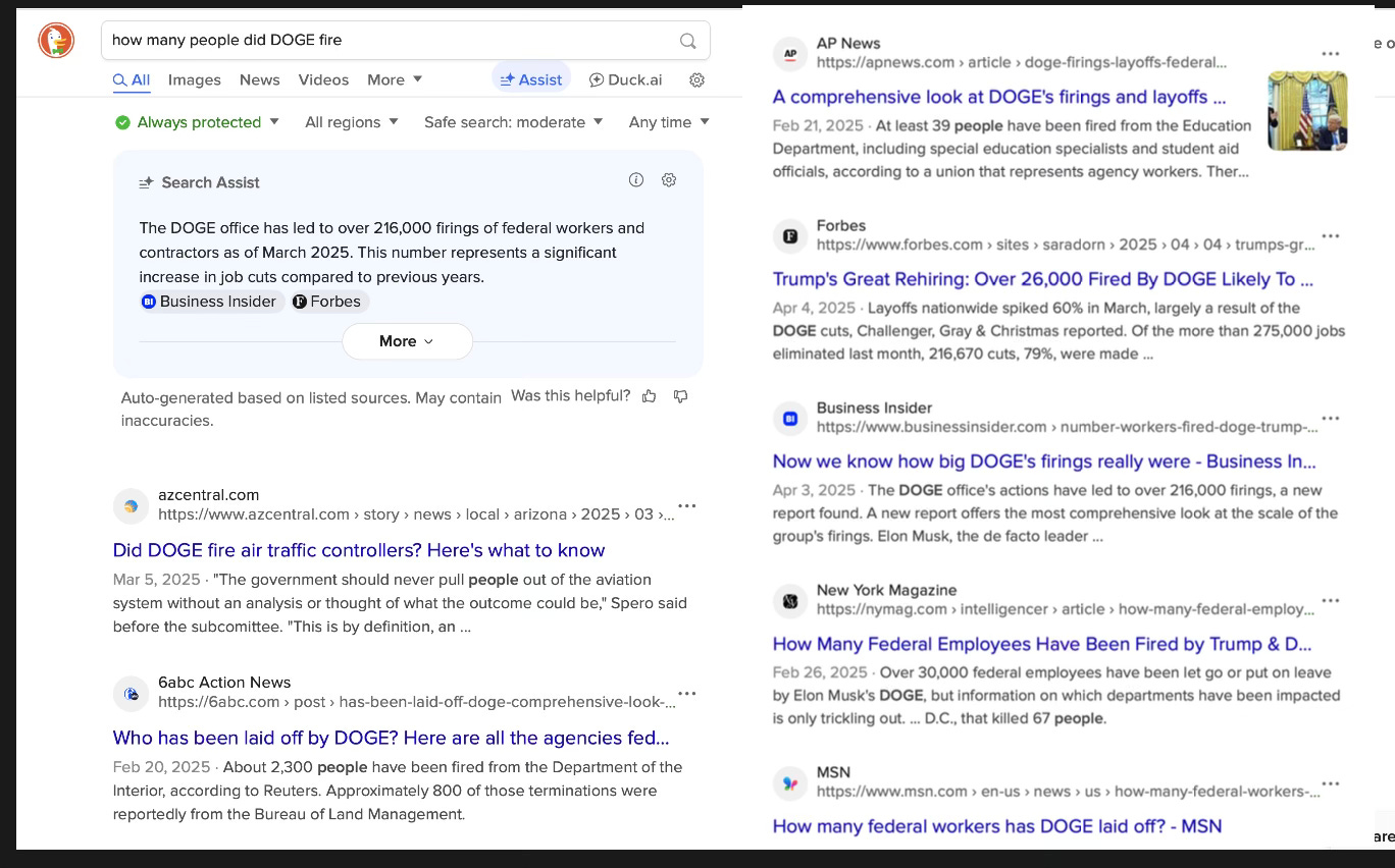 Depending on where you look the numbers of people who lost their jobs because of DOGE start at a low of 130,000 and go up from there. This is a Google search for aritlces about this.