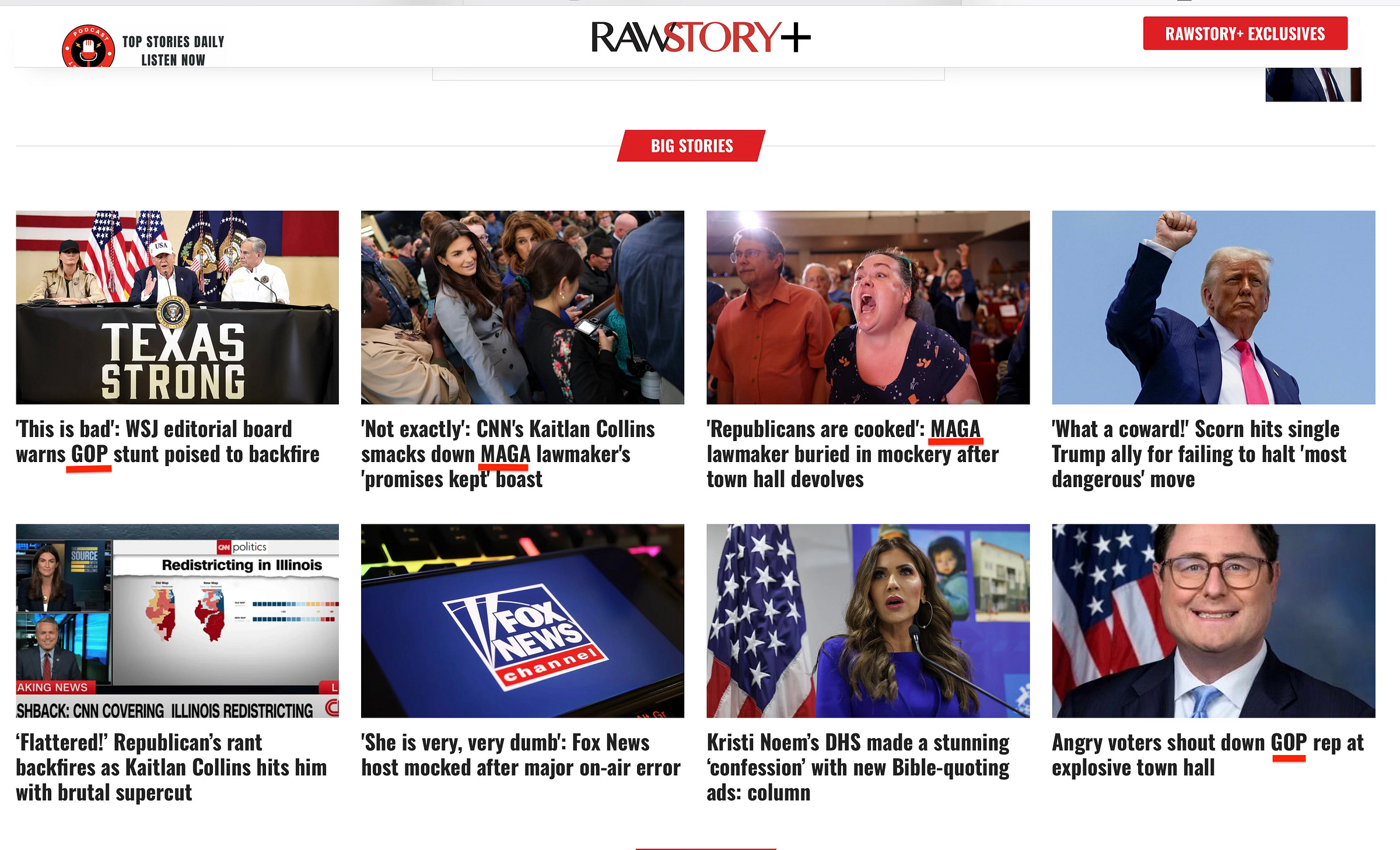 Just down their page, half the articles have either GOP or MAGA in the titles, and all of them are about difficulties Republicans, including Trump and Kristi Noem, are having.