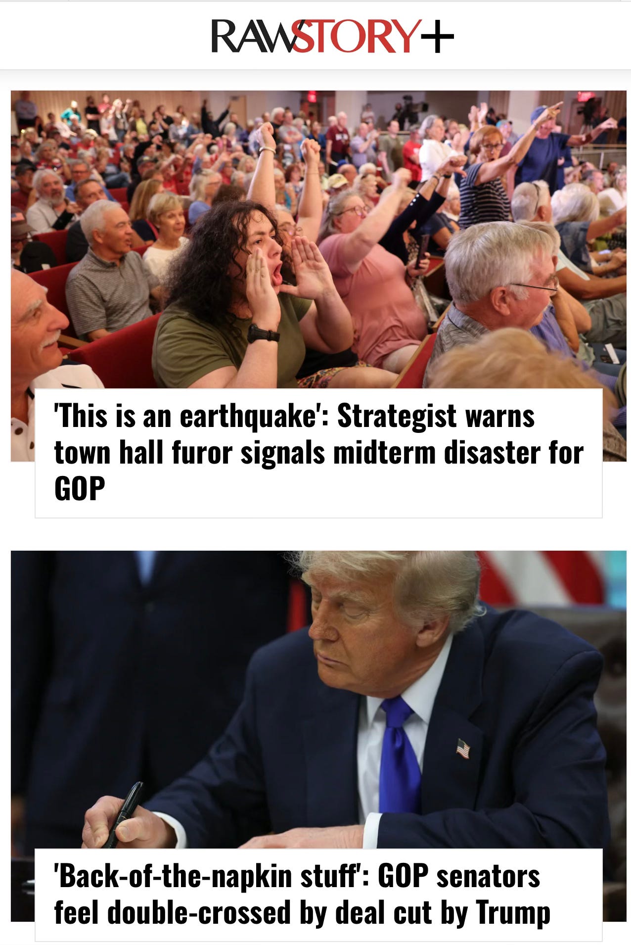 The first two articles on RawStory at 6 this morning (Pacific time) were 'This is an earthquake': Strategist warns town hall furor signals midterm disaster for GOP and 'Back-of-the-napkin stuff': GOP senators feel double-crossed by deal cut by Trump.