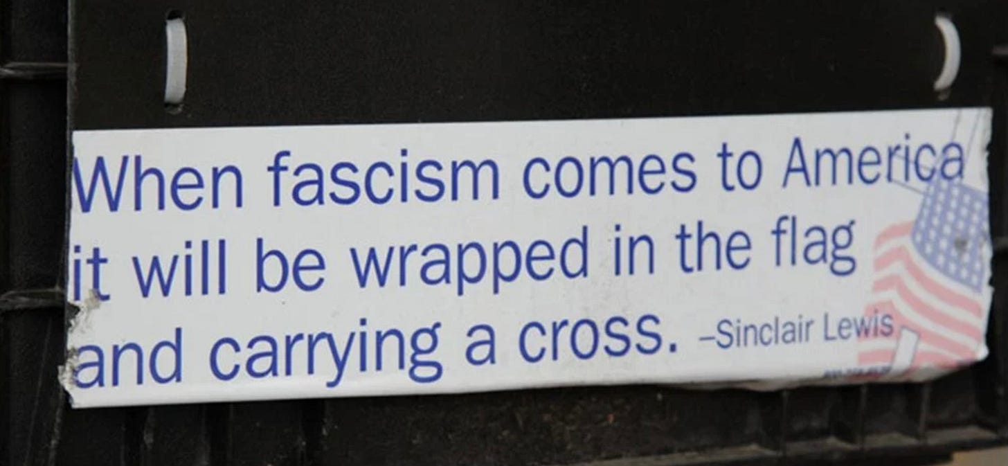 My comment: This quote, inaccurately attributed to Sinclair Lewis ( see Snopes) from his prescient novel "It Can't Happen Here" certainly applies to this article: