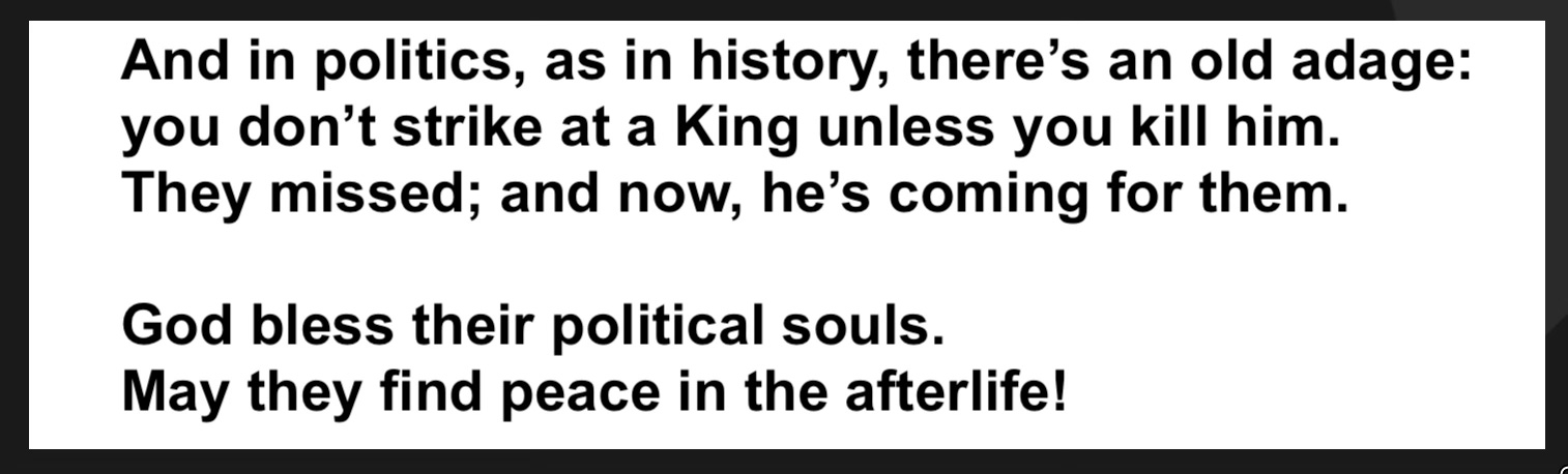 Trump’s version is anything but a sad song. Not for him, it isn’t. It is a victory ballad. Once upon a time, he could spaz dance to the original version about “merely” owning the Republican Party lock, stock and fucken smoking barrel. Now he all but owns the country.