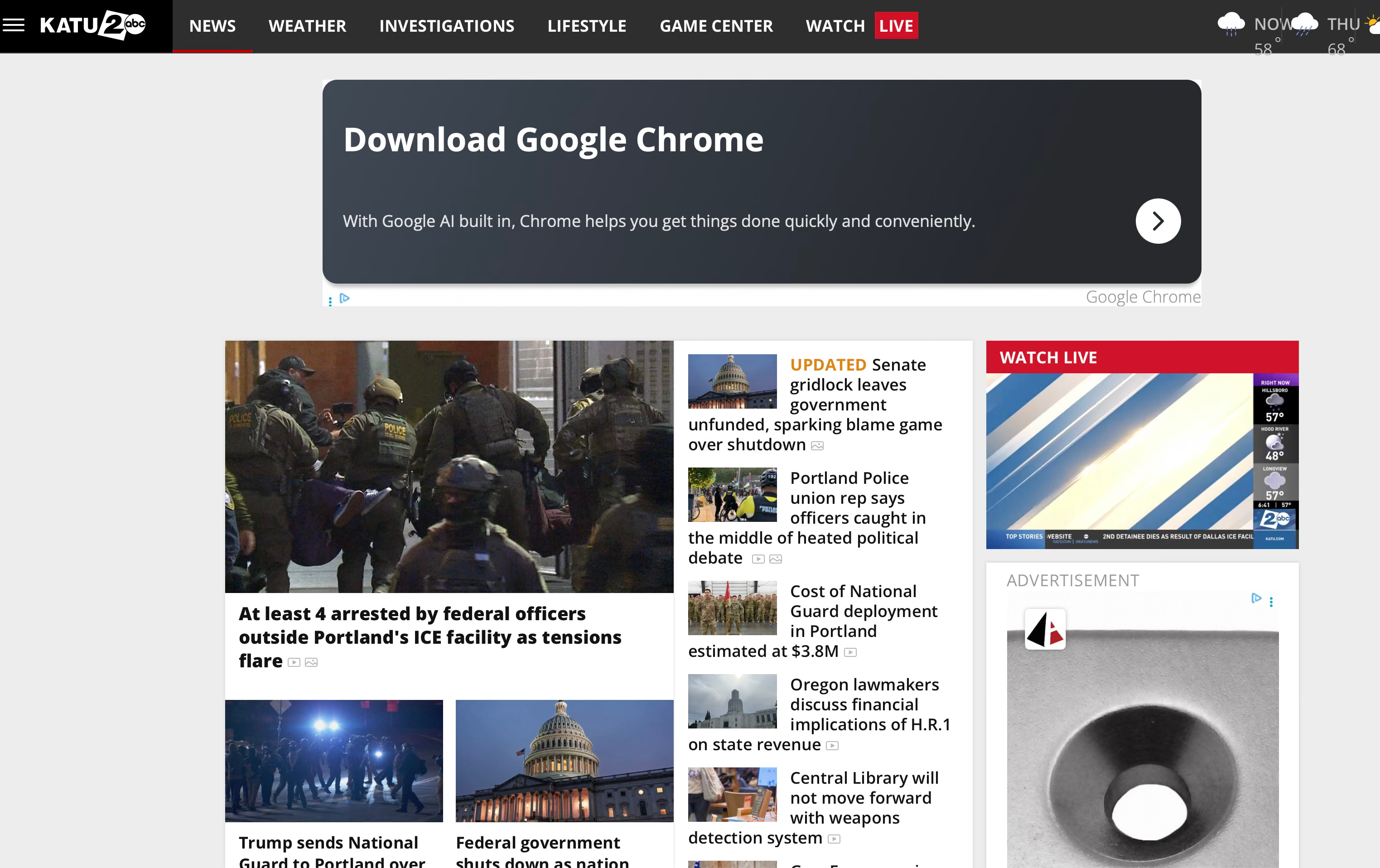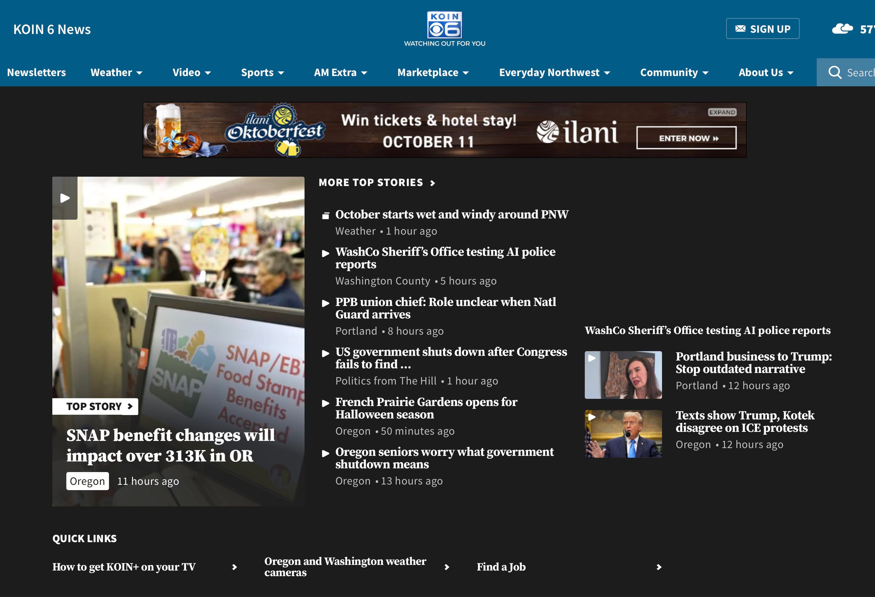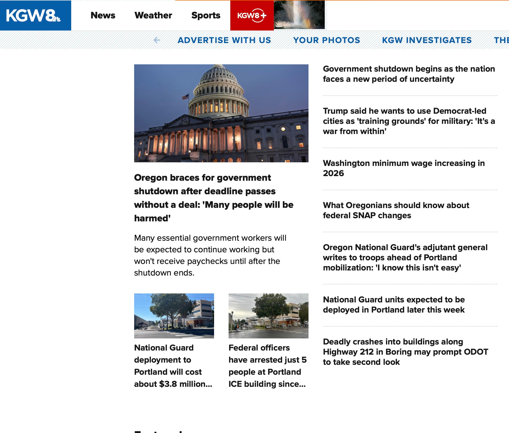 because it is the Sinclair station and unlike the other three it’s main story is “At least 4 arrested by federal officers outside Portland’s ICE facility as tensions flare” obviously meant to support Trump’s false narrative. As featured article the other stations have “‘Oregon has no choice’: New SNAP requirements will impact over 313K residents”, “Oregon braces for government shutdown after deadline passes without a deal: ‘Many people will be harmed’ as top stories,” and on OPB “Portland troop deployment expected to cost at least $3.8 million.”